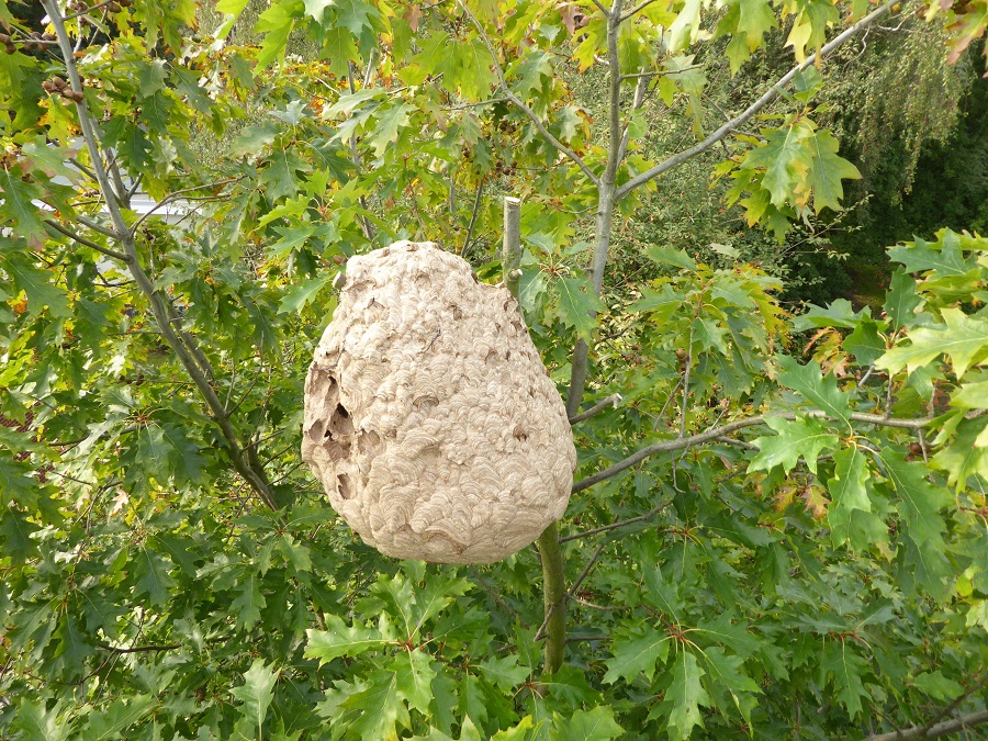 Von unserer einheimischen Hornisse ist sie leicht zu unterscheiden. Sie ist etwas kleiner als unsere Hornisse, hat einen schwarzen Brustabschnitt und zu den Spitzen hin gelbe Beine. Diese invasive Insektenart füttert ihre Brut hauptsächlich mit erbeuteten Honigbienen. Deshalb steht sie europaweit auf der Liste unerwünschter Insekten. In Deutschland ist ihr Vorkommen meldepflichtig. Einzeltiere und ihre Nester müssen deshalb den zuständigen Behörden angezeigt werden. Die Nester, (Bild: Landesanstalt für Umwelt Baden-Württemberg) die einen Durchmesser von fast einem Meter erreichen können, werden meistens in den Kronen hoher Bäume angelegt. Sie sind zwischen den Blättern verdeckt. Oft werden die Nester erst im Herbst, wenn das Laub abgefallen ist, entdeckt.